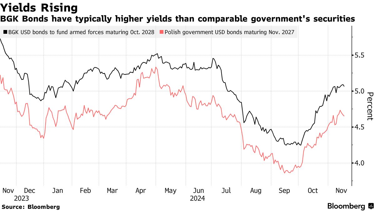 波兰政府债券的收益率在过去几个月中由于预算政策宽松以及对新兴市场债务的情绪恶化而有所上升。投资者要求持有BGK以美元计价的票据(作为其武装部队支持基金的一部分,2028年到期)相对于类似期限的主权美元债券的额外收益率,自去年该贷款机构的票据出售以来,平均为40个基点。