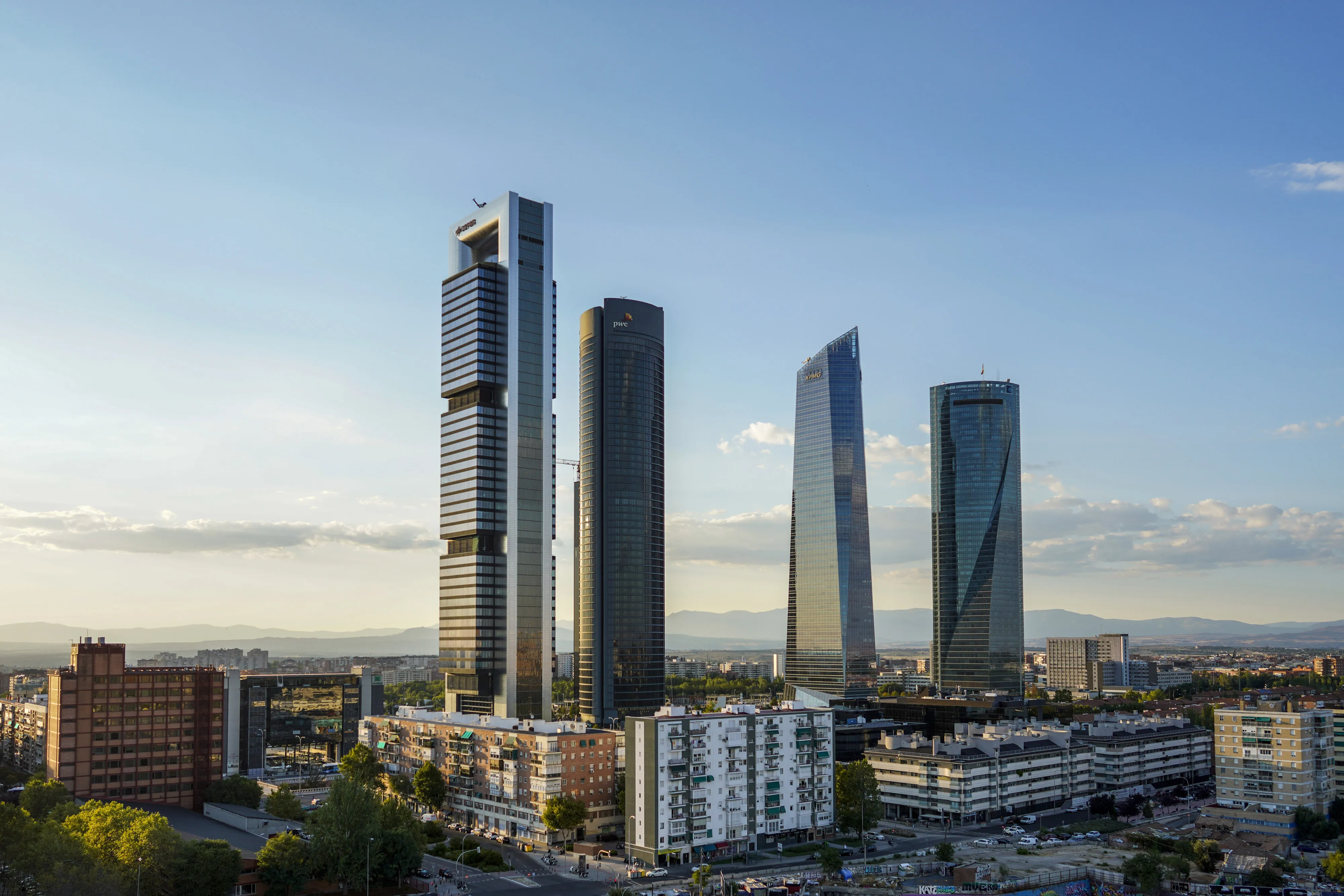 马德里的银行摩天大楼。照片:保罗·汉娜/彭博社新的税率适用于年收入超过50亿欧元的银行,这意味着全国最大的银行将受到影响,包括 桑坦德银行 和 BBVA。
