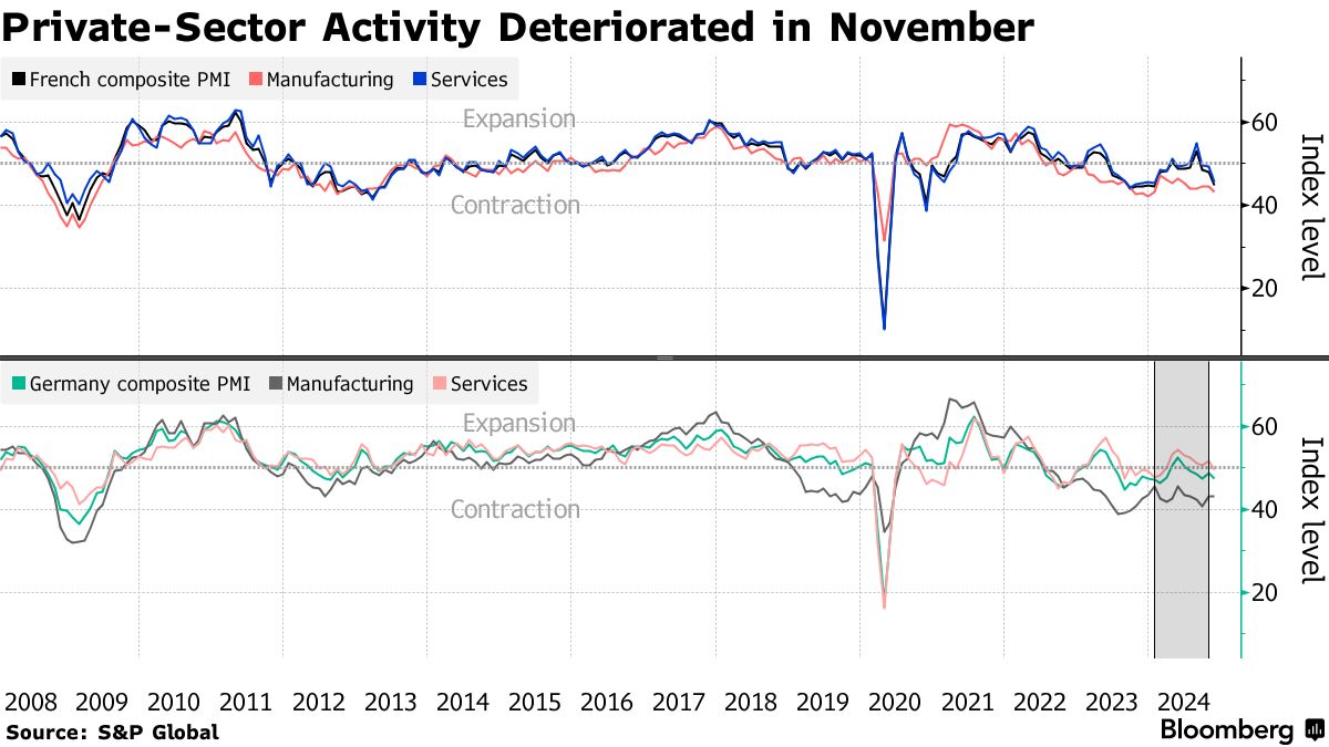 在德国,11月份私营部门活动的收缩加剧,给正在面临政府崩溃和经济增长停滞的经济带来了又一次打击。