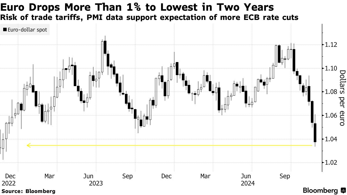 欧元跌至两年来的最低水平,因为交易员押注欧洲中央银行将不得不大幅降息以提振该地区的经济。