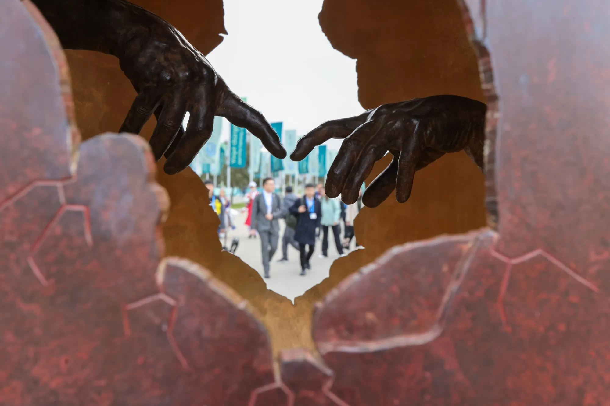 洛伦佐·昆的雕塑“自然中的平衡”在阿塞拜疆巴库的COP29气候大会上,时间是11月13日。