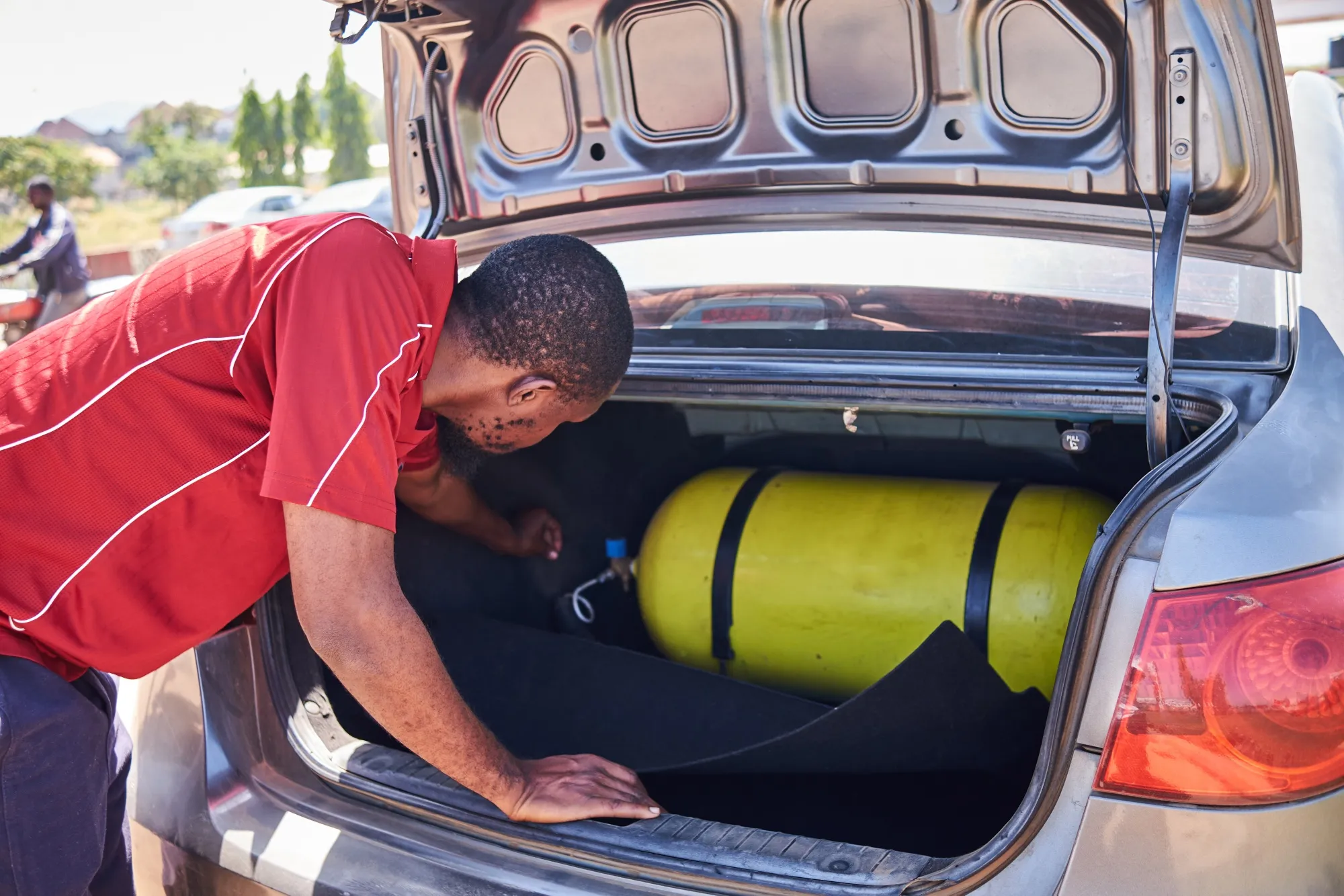 一辆改装车后备箱里的气瓶。摄影师:达瓦利·大卫·出埃及/Bloomberg
