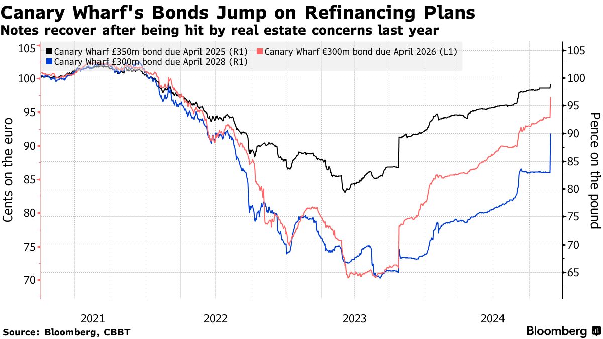 由于市场预计将用新债务再融资这些票据,2026年到期的Canary Wharf债券领涨,数据显示,这些票据在当天上涨了2.9美分,报97.2美分,创下年度最大涨幅。