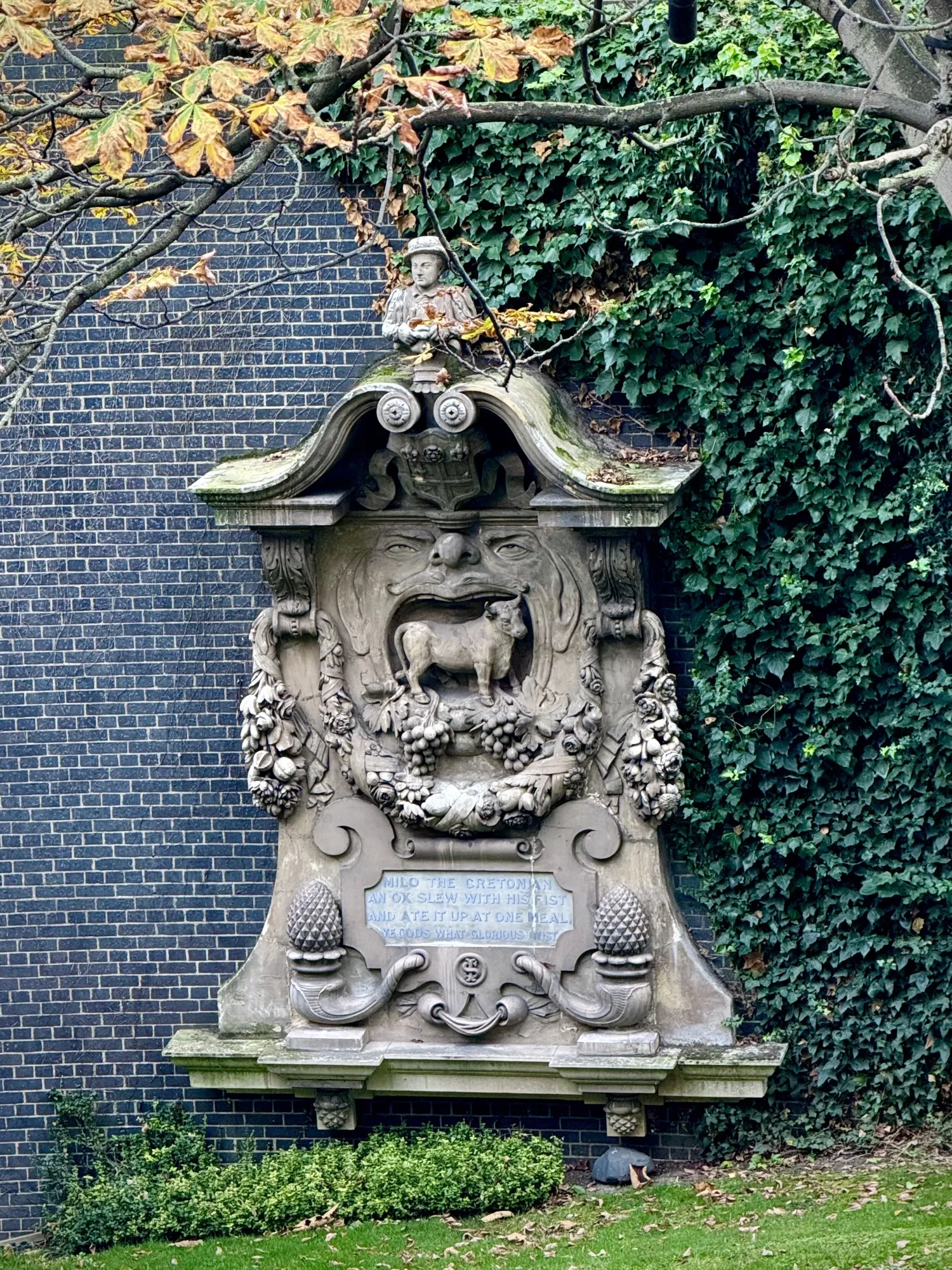 在旧伦敦博物馆的遗址上——在巴比肯中心的南缘——有一个花园,通常可以预订用于活动。这个区域总是处于被拆除以进行某个大型项目的边缘。因此,我窥探了一下可能会失去的东西。在一面墙旁边有一个大型石碑,上面描绘着一个有胡子的头,圆圆的侏儒鼻子和张开的嘴,似乎要咬下一个相当健壮的公牛,公牛站在一堆多汁的葡萄上。这是即将到来的盛宴季节的一个合适的预兆。但这是什么呢?