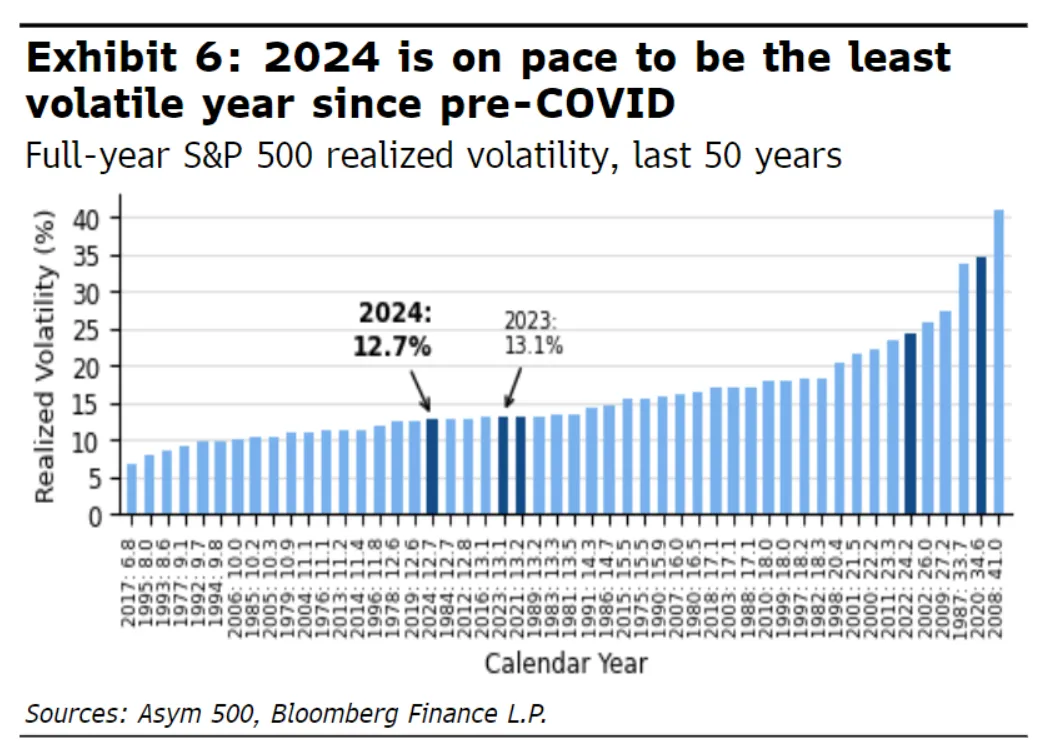 但尽管发生了这么多大事,股市的波动性指标几乎没有变化。曾在高盛工作的洛基·费什曼,现在在 Asym 500,指出2024年有望成为自疫情前以来波动性最低的一年。