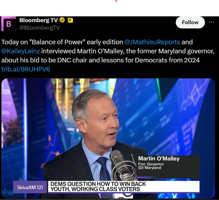 今天在彭博电视台的权力平衡早间版中,主持人乔·马修和凯莉·莱因茨采访了前马里兰州州长马丁·奥马利,讨论他竞选民主党全国委员会主席的计划以及2024年对民主党的教训。