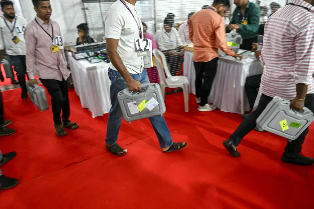 11月23日在孟买的马哈拉施特拉州议会选举计票中心的选举工作人员。