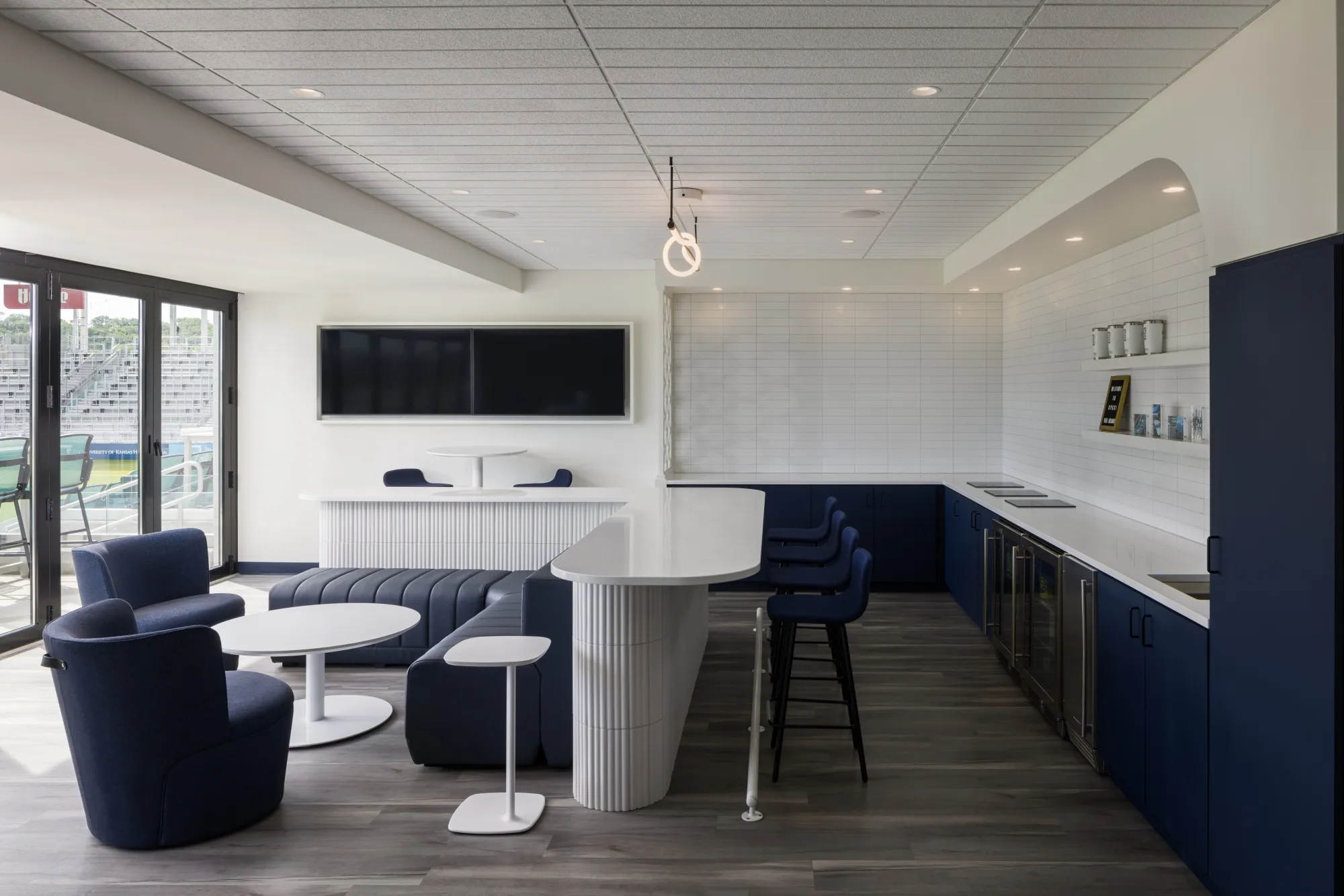 由于套房距离球场非常近,Generator大多让“运动自我发声,”富兰克林说,避免了足球主题的装饰。艺术编程包括套房和走廊中的当代画作和印刷品。波纹金属和混凝土块为设施增添了厚重感。对于普通球迷来说,一些原本极简的走廊小吃空间的墙壁上出现了俏皮的城市图像。