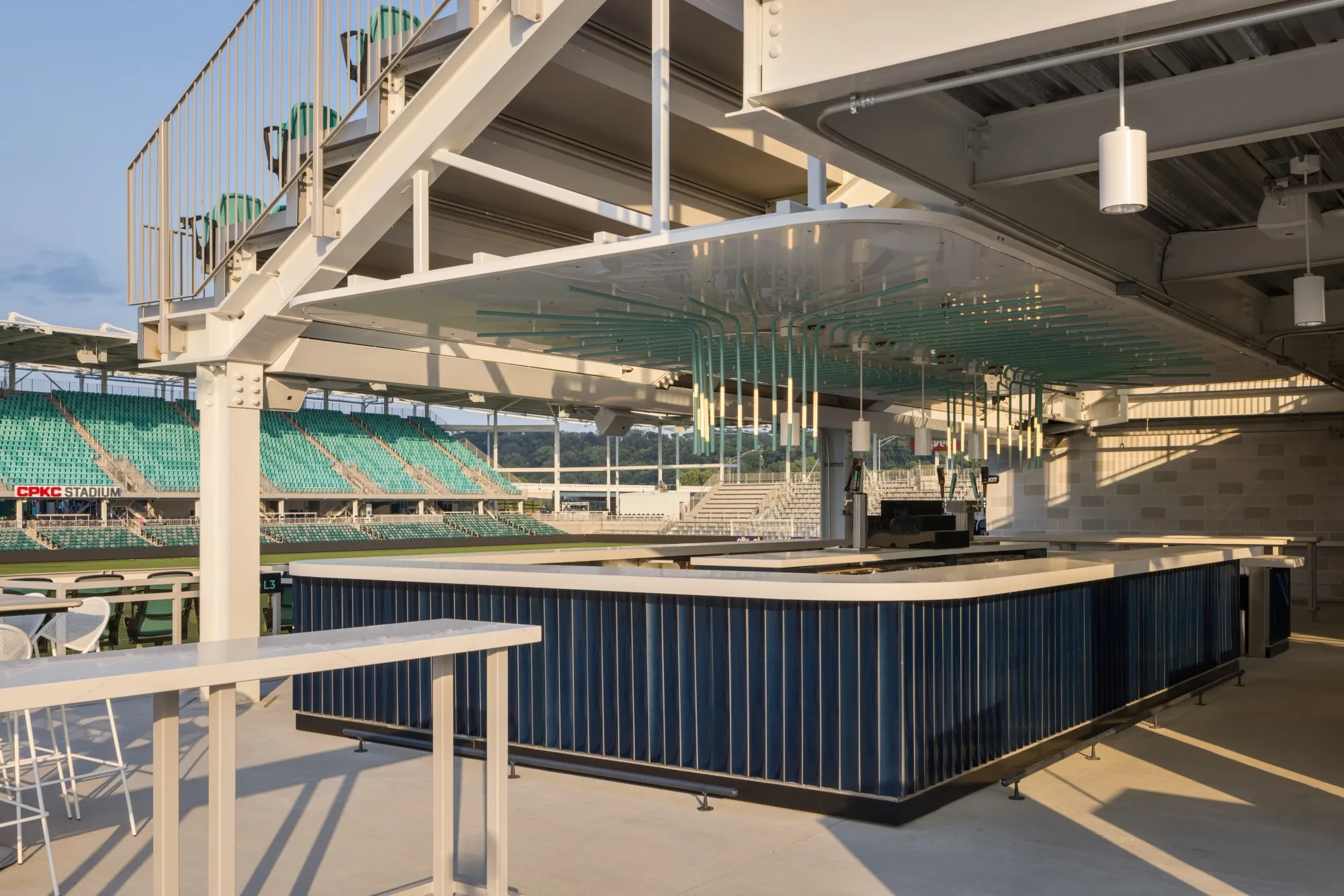 CPKC体育场提供了球场和海滨的美景。摄影师:内特·希茨摄影Generator设计的CPKC是一个亲密的两层结构,U形屋顶向密苏里河开放。驾驶员在邦德桥上可以轻松地窥视到CPKC的球场和一片青色座椅。每根白色涂漆的结构钢梁之间的宽开口可能暗示着预算紧张,但整个设施几乎没有传达出小型体验的感觉,无论是对球员还是球迷。