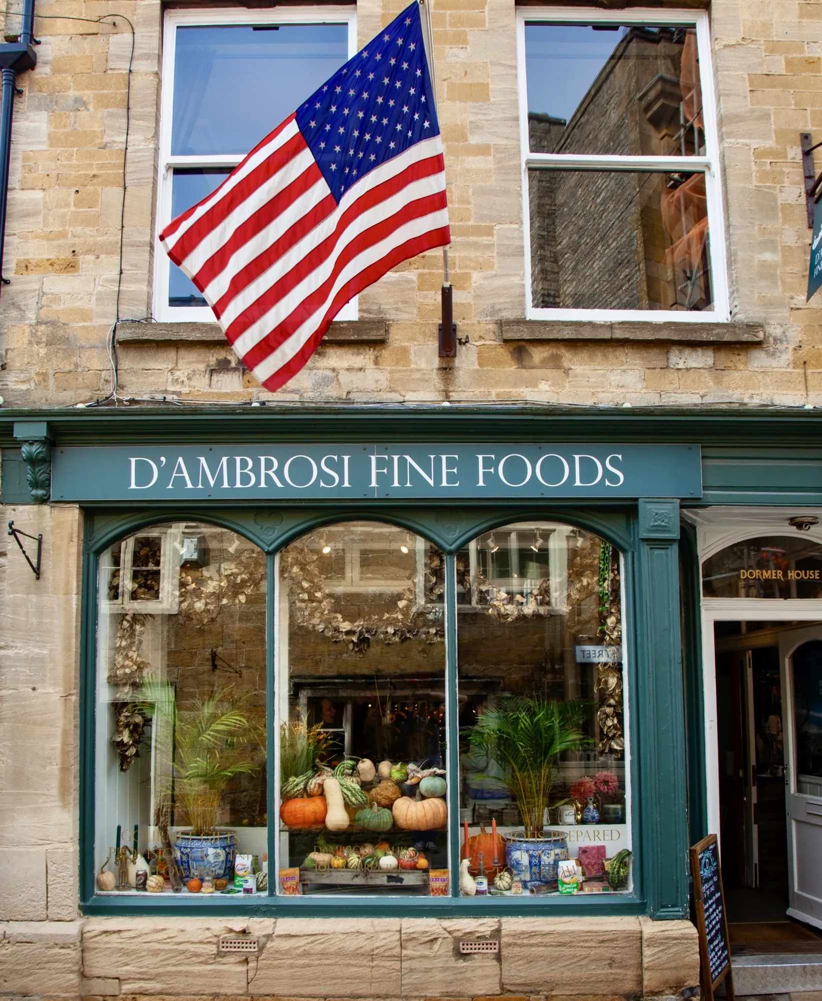 位于斯托-翁-沃尔德的D’Ambrosi美食店。摄影师:乔纳森·韦斯特D’Ambrosi美食店在疫情期间于历史悠久的市场镇斯托-翁-沃尔德开业,悬挂着星条旗,由美国人杰西和安德鲁·D’Ambrosi拥有(如在 顶级大厨 中所见),他们已将科茨沃尔德作为新家。