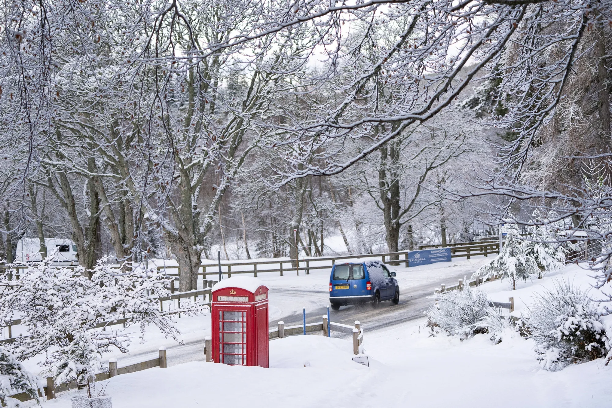 一辆汽车在阿伯丁郡巴尔莫勒尔附近的A93公路上穿越雪和冰,时间是11月22日。