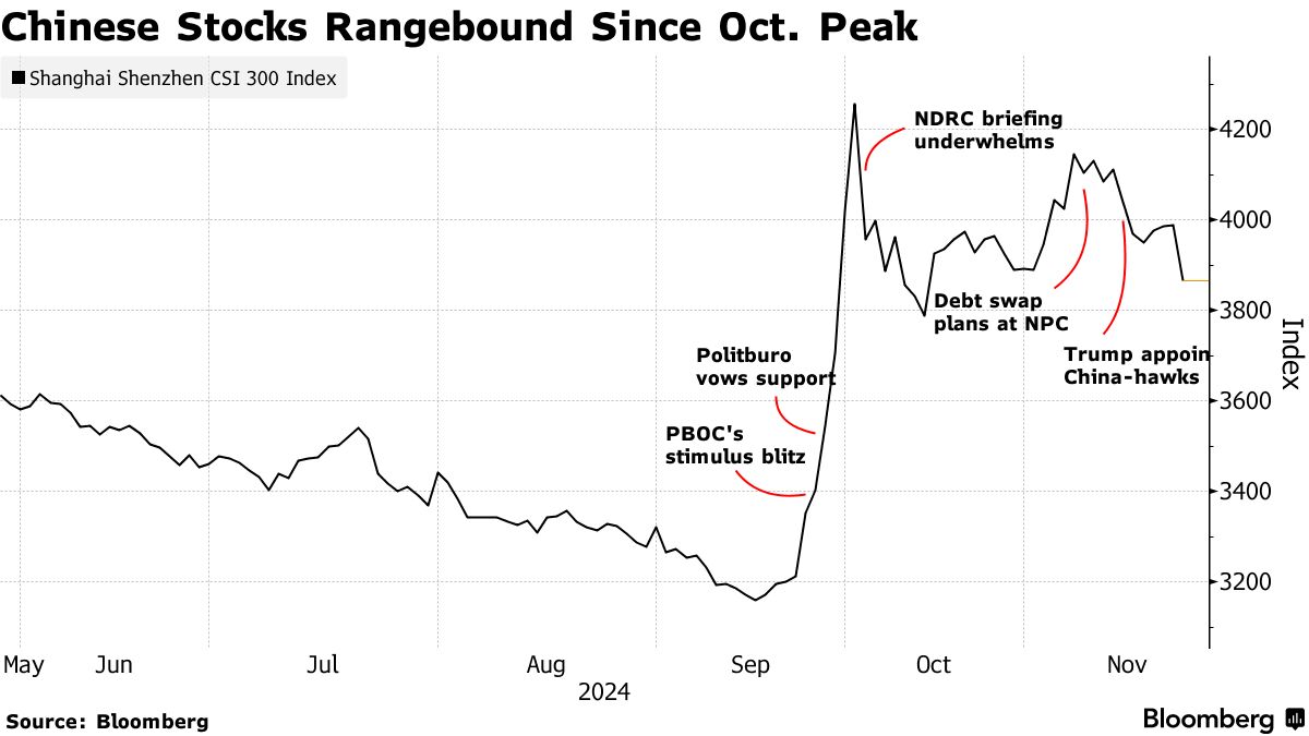 在九月底中国货币刺激措施的 轰炸 之后的狂喜现在已转为谨慎。然而,投资者感受到习近平主席在经历了多年的去杠杆化运动后,明确的政策转向以稳定经济,这一转变对股票来说是个好兆头。尽管最近有所下滑,CSI 300 指数 今年已上涨超过12%,有望实现自2020年以来的首次年度增长。