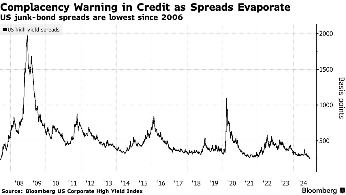 有资金可支配且新交易较少的资产管理者推动信用利差接近历史最低水平,因为全球经济依然强劲。这对一些人来说是购买下行保护的信号。