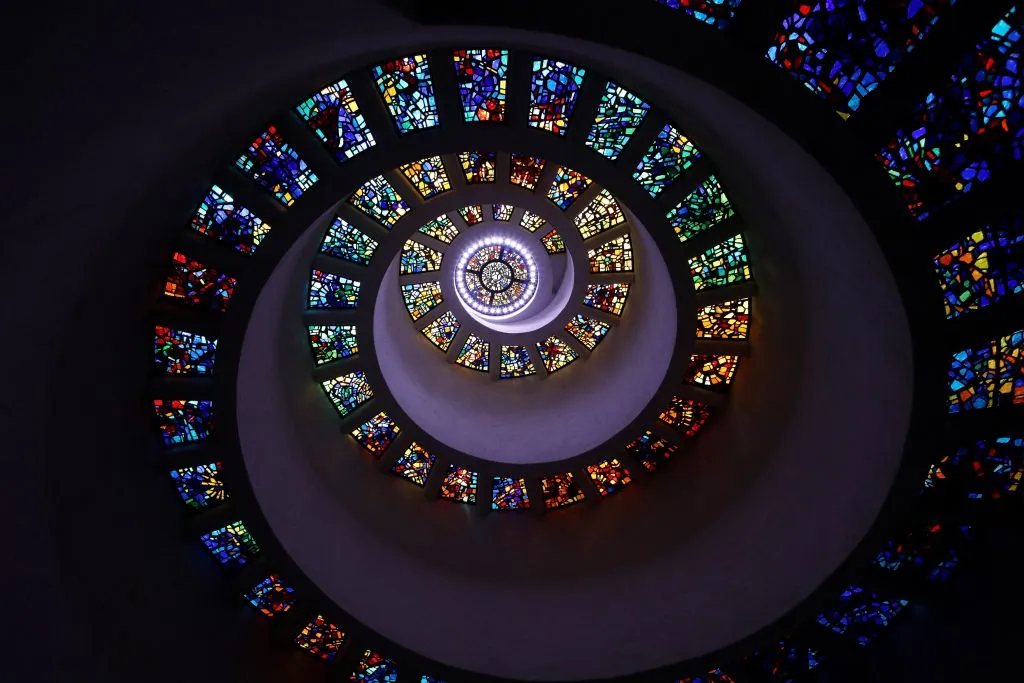 事实上,感恩教堂是神圣建筑的一个例子,尽管它有些独特。它是一个非宗派的圣地,供所有信仰的人使用:与其说是一个崇拜的地方,不如说是一个服务的场所。这座90英尺高的建筑简单明了;光线通过由法国艺术家加布里埃尔·洛伊尔设计的螺旋彩色玻璃天花板流入内部。螺旋结构的模型是伊拉克萨马拉大清真寺的 马尔维亚尖塔,它本身是古代伊朗的 特尔巴尔 的后裔。与派没有太大关系。