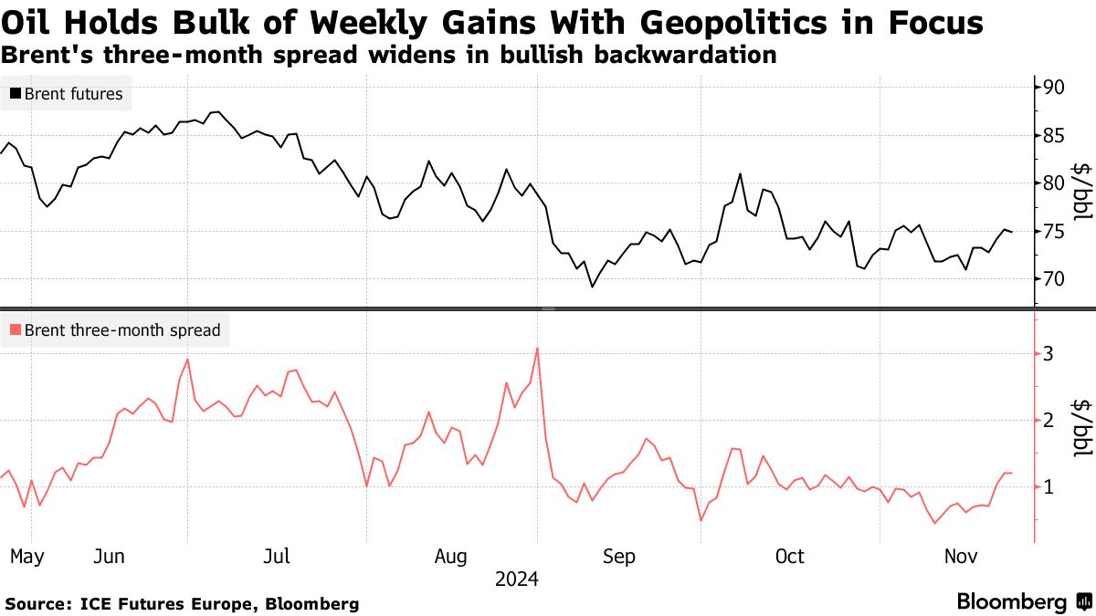 自十月中旬以来,油价在每桶约6美元的范围内波动——在每周的涨跌之间交替——因为对地缘政治紧张局势影响供应的担忧抵消了对2025年供应过剩的预期。石油输出国组织 将在本周末召开会议决定生产计划,包括花旗集团和摩根大通在内的银行预计将 再次推迟计划中的增产。