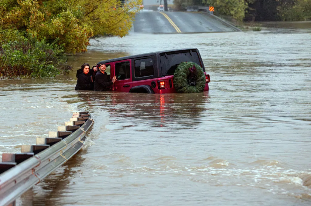 一对被困的情侣紧紧抓住他们在加利福尼亚温莎的洪水中被困的车辆,时间是11月22日。