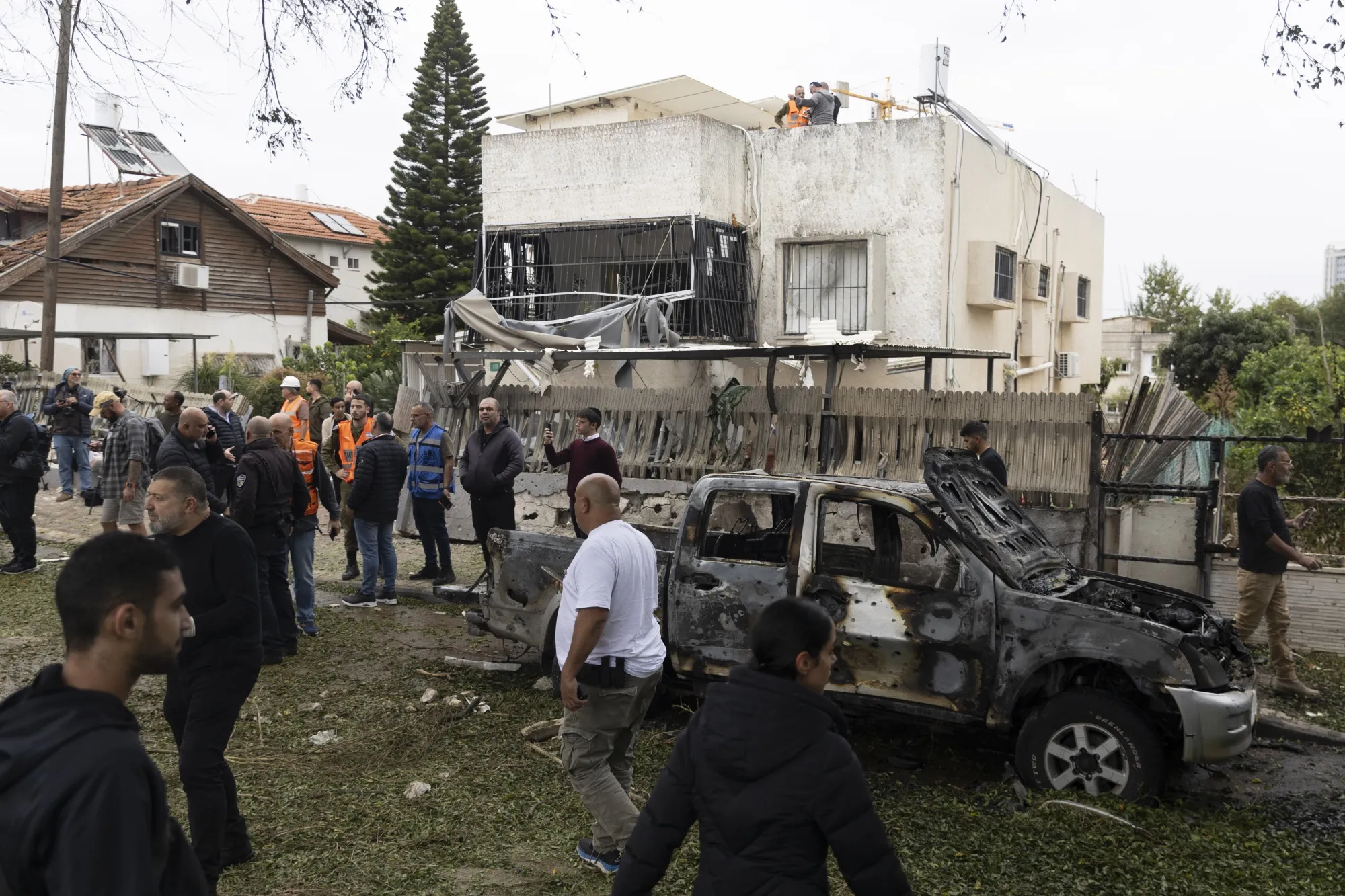 人们在以色列佩塔提克瓦查看来自黎巴嫩发射的火箭造成的损害,时间是11月24日。摄影师:阿米尔·莱维/盖蒂图片社