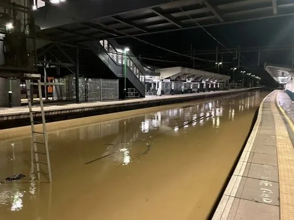 由于尼恩河决堤导致的严重洪水,诺桑普顿火车站的洪水。来源:西海岸主线气象局周一对苏格兰发布了黄色风警告,预计暴风雨将在周二从远东北部消散。风速将超过70英里(113公里)每小时。