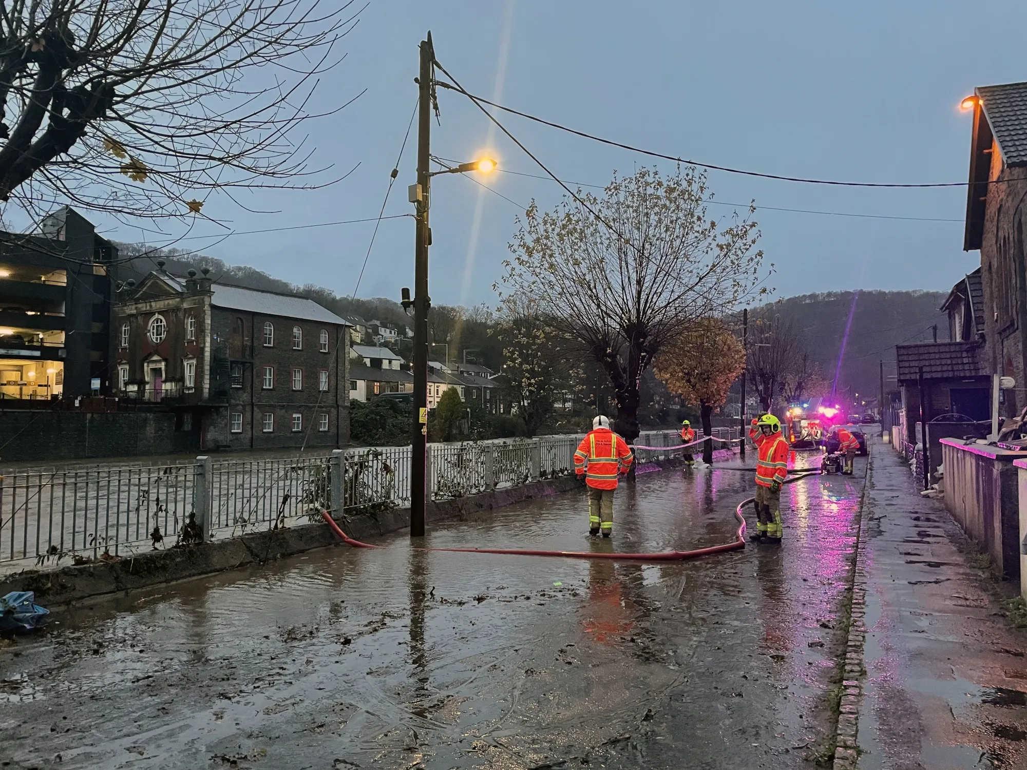 威尔士庞蒂普里德的消防员正在抽排洪水,11月24日。