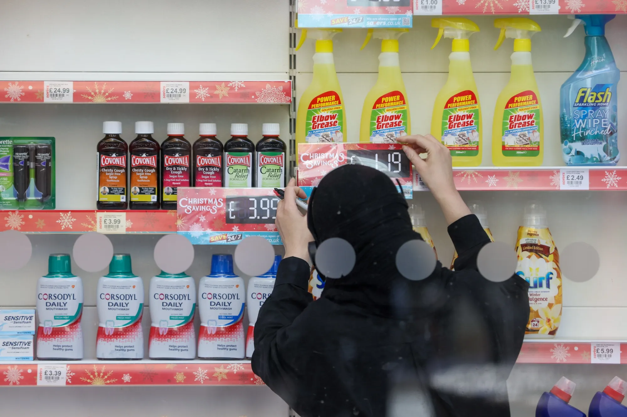 一名员工在斯劳的一家商店展示圣诞储蓄价格。