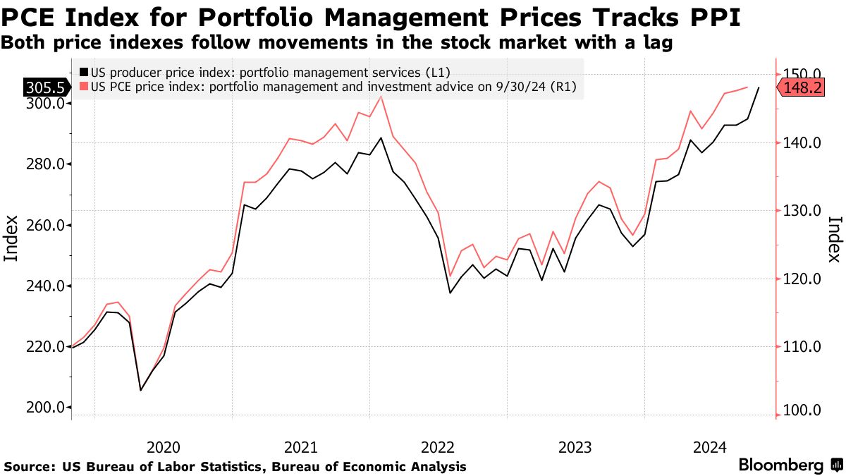 选举后股价的 激增 将被记录为投资组合管理和投资咨询服务成本的增加,这一类别在个人消费支出价格指数中,主要跟随市场波动。该类别的变动对美联储的政策决策有直接影响,因为它们影响着官员密切关注的更广泛服务通胀的关键指标。