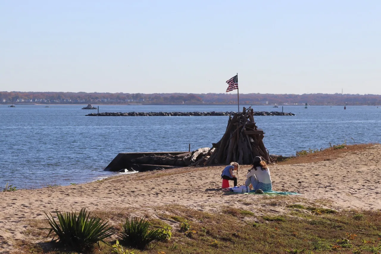 我到达了斯塔滕岛南端的罗宾逊海滩,发现一条狭窄的沙滩,柔和的秋色和宁静的蓝色海水。在我面前,八排庄严的堆叠岩石沿着海岸线排列,或许在拉里坦湾外约四分之一英里处。