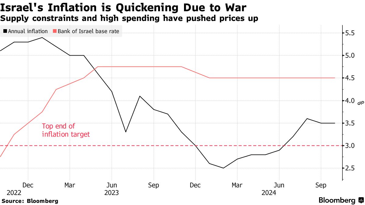 截至10月,该国的年通胀率为3.5%,高于政府设定的1%至3%的目标范围。这主要是由于供应方面的限制。建筑和农业部门受到禁止进入以色列的巴勒斯坦工人短缺的影响,导致过去一年租金和食品价格显著上涨。