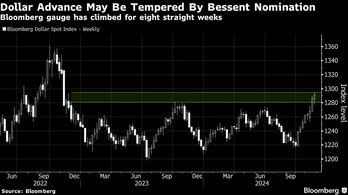 贝森特的任命“支持了一个新兴的叙述,即特朗普激进政策的极端风险被夸大了,”西太平洋银行外汇策略主管理查德·弗兰卢维奇表示。“特朗普的检察总长提名失败强化了制衡机制可以缓和特朗普激进政策提案的信息。”