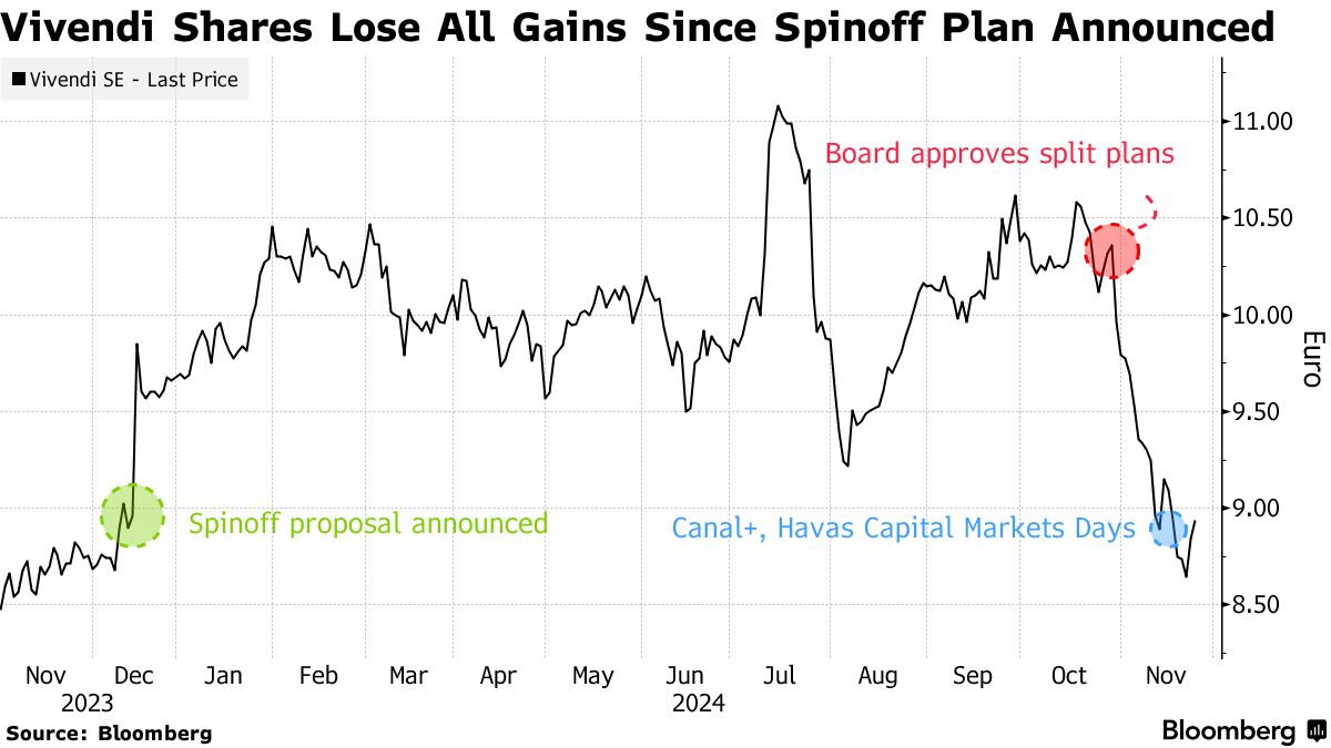 维旺迪的股价自十月高点以来已下跌16%,抹去了自2023年底法国综合企业宣布潜在拆分以来的所有涨幅。在截至周一收盘的19个交易日中,有16个交易日股价下滑,投资者质疑这一期待已久的拆分是否真的能缓解所谓的综合企业折扣。