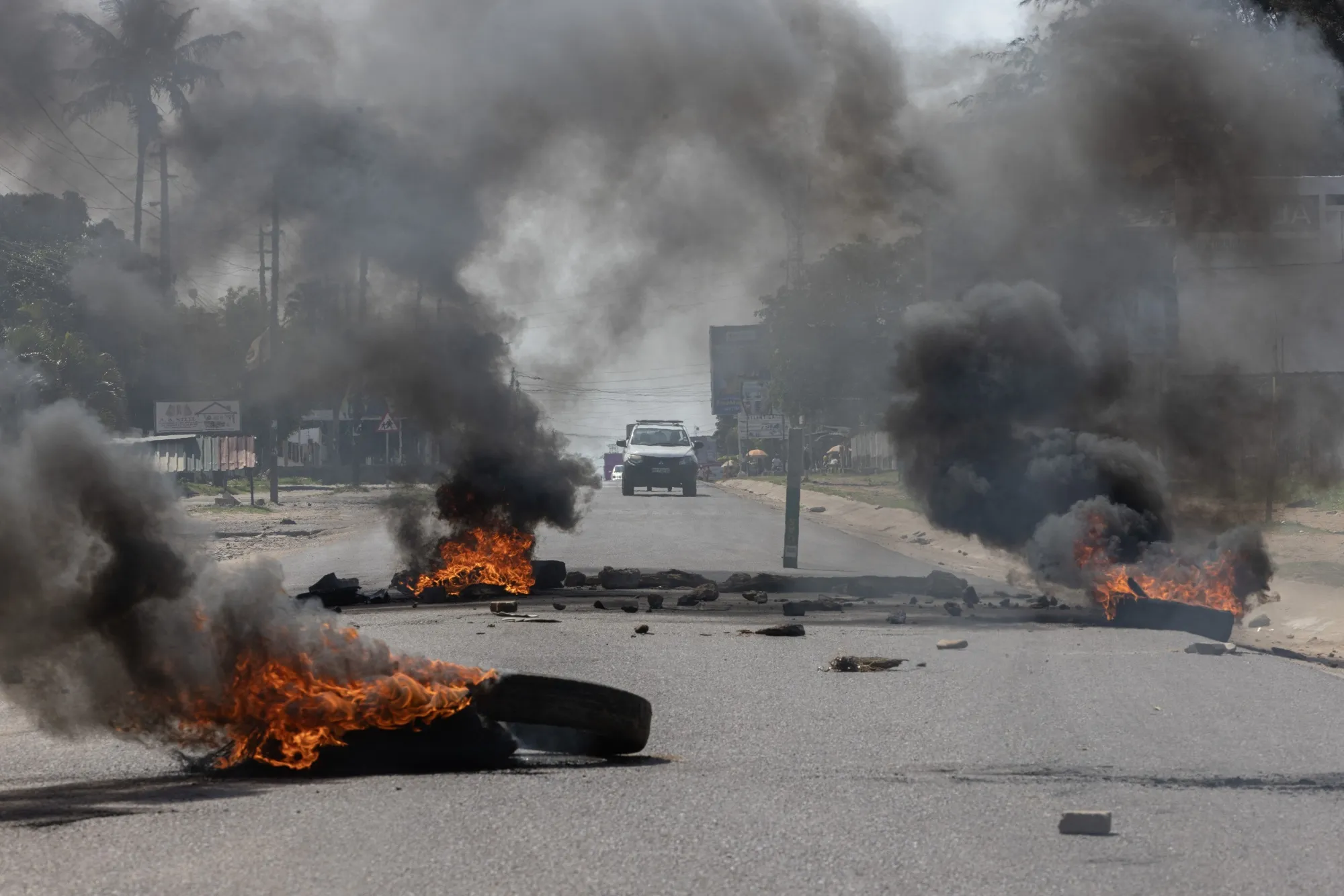 在莫桑比克马普托的乔帕尔社区,11月15日抗议期间燃烧的路障,莫桑比克正面临自三十年前拥抱民主以来最不稳定的选后时期。