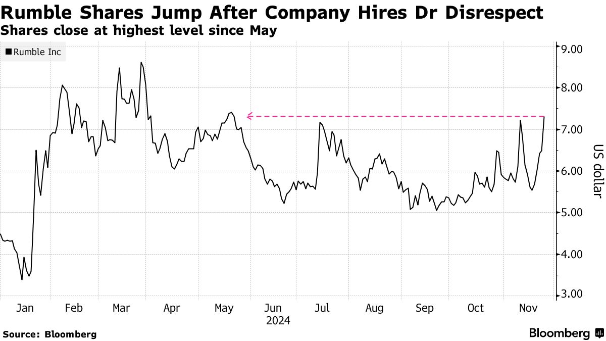 Rumble Inc.的股票在周一上涨了13%,因为这家保守派视频流媒体平台聘请了一位名为Dr Disrespect的在线名人来领导Rumble Gaming。