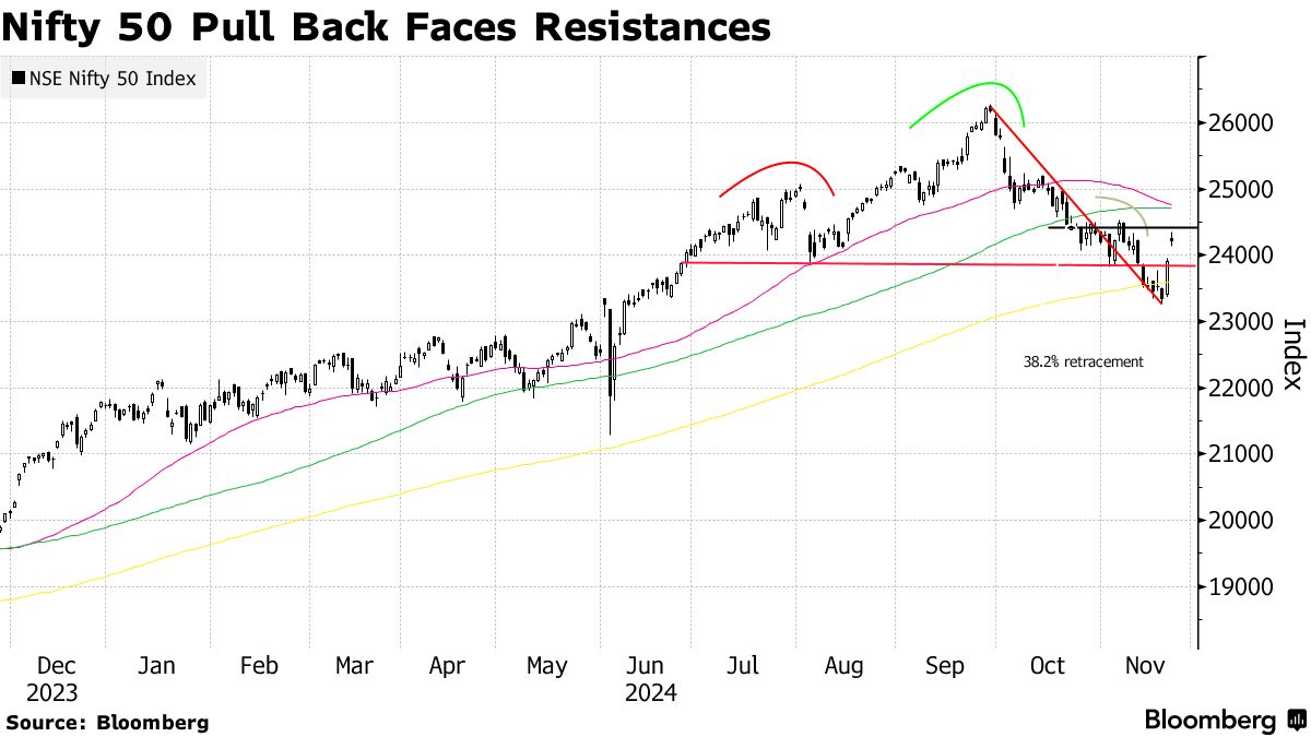 印度股市终于走出低迷了吗?图表分析师说还不太快。确实, 基准指数已上涨 大约 5% 从 11 月 21 日的低点,但面临多个障碍。首先是 24,415 的 38.2% 斐波那契回撤位。接下来是 24,537 的看跌头肩形态的右肩。最后,在 24,700 和 24,740 之间有一个困难区域,50 日和 100 日均线都在此处。