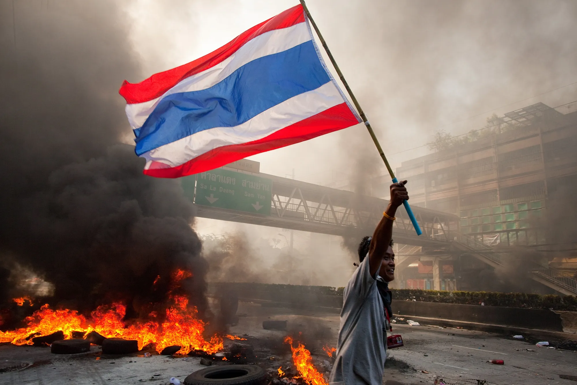 一名红衫军抗议者在2010年5月的曼谷燃烧的轮胎中举着泰国国旗。摄影师:Paula Bronstein/Getty Images AsiaPac### 为什么他信和英拉流亡?