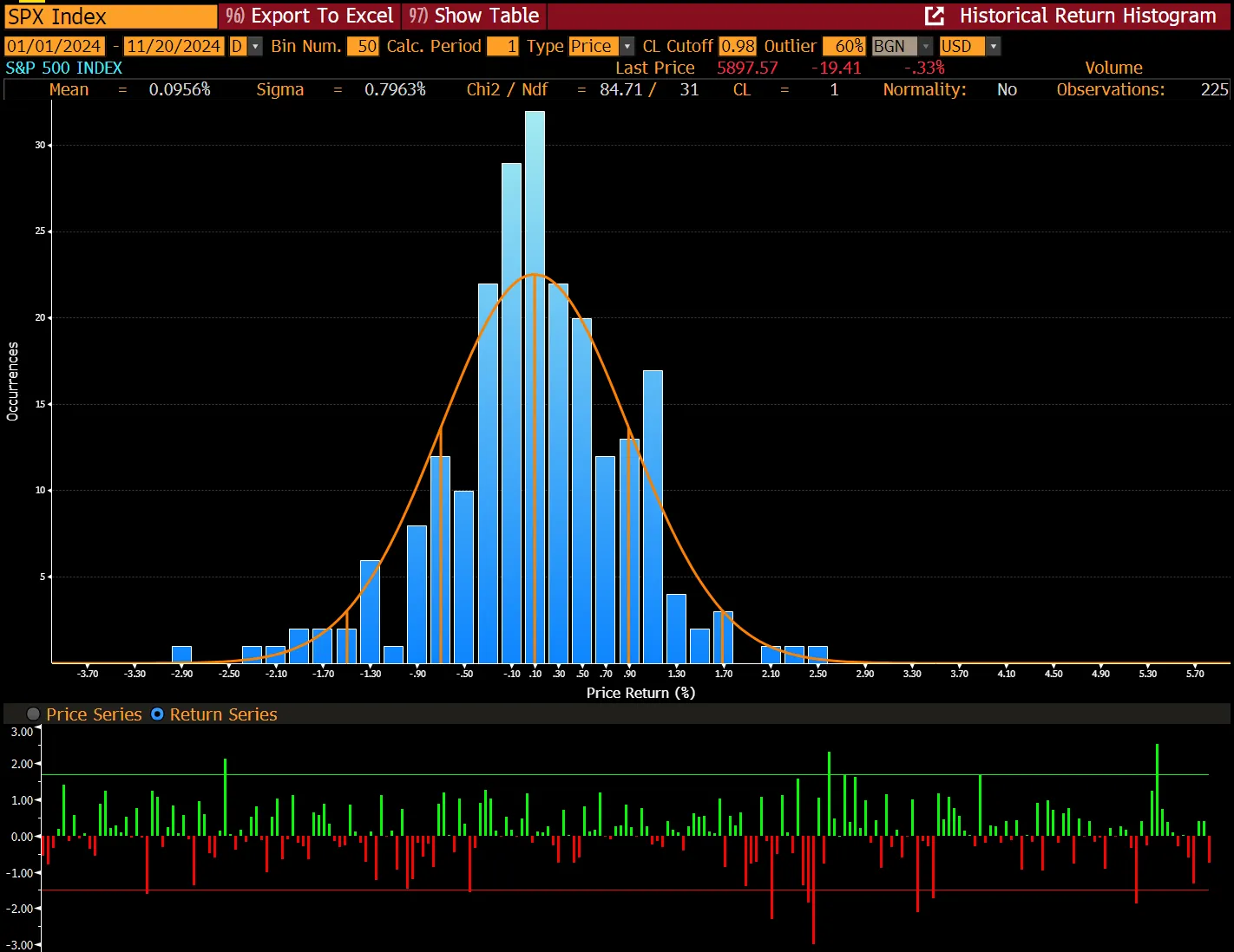 来源:彭博社S&P 500的收益分布描绘了一年中几乎没有恐慌或匆忙风险降低的情况。每日波动——无论是上涨还是下跌——并没有导致强烈的异常,大多数价格波动保持在正常范围内。夏季的修正是一个例外,因经济前景和利率叙述的突然变化导致被迫降低风险,投资者迅速买入了下跌。