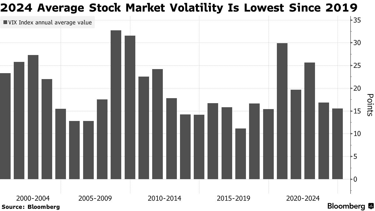 VIX显示2024年股票波动性已是五年来最低 - 彭博社