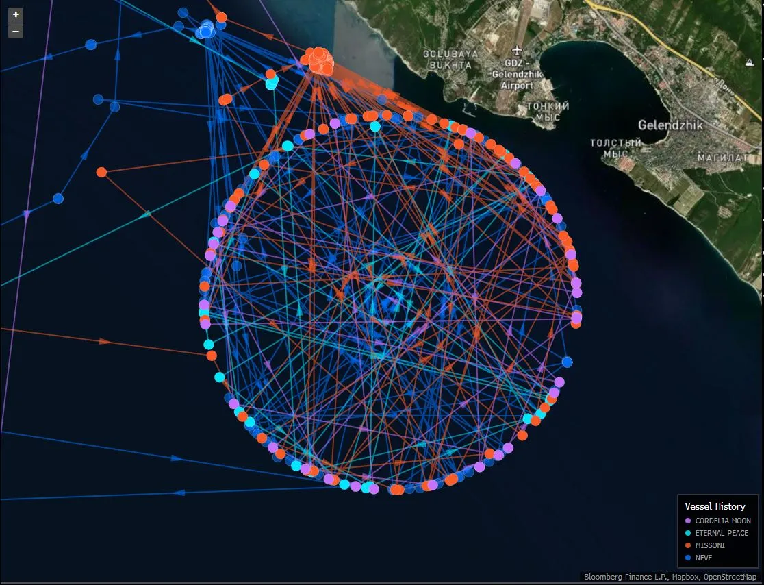 2024年9月,俄罗斯黑海港口诺沃罗西斯克附近的油轮发送的欺骗位置信号显示四艘不同油轮呈现出同样不切实际的精确圆形模式。彭博社传统的识别系统现在通常与其他来源结合使用,以确认用于掩盖受制裁货物真实来源的操作。