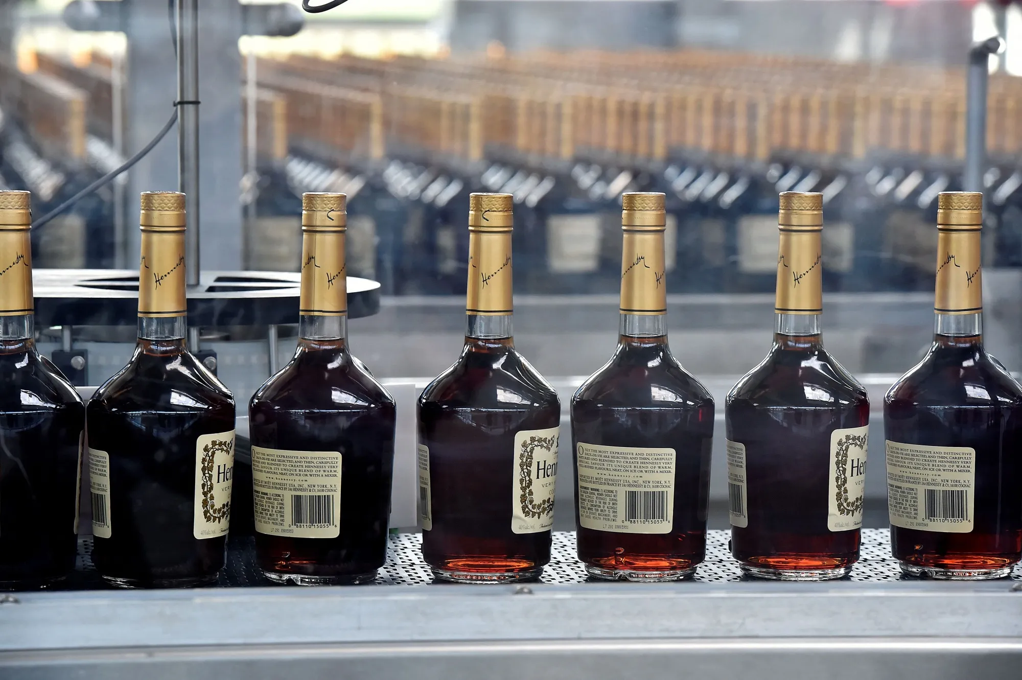 亨利西的装瓶厂中的干邑酒瓶。摄影师:Georges Gobet/法新社/盖蒂图片社**干杯!亨利西的工人在法国赢得了胜利。**LVMH品牌暂停了将干邑 送往中国装瓶的计划,因为工人们罢工,平息了对失业和质量问题的担忧。