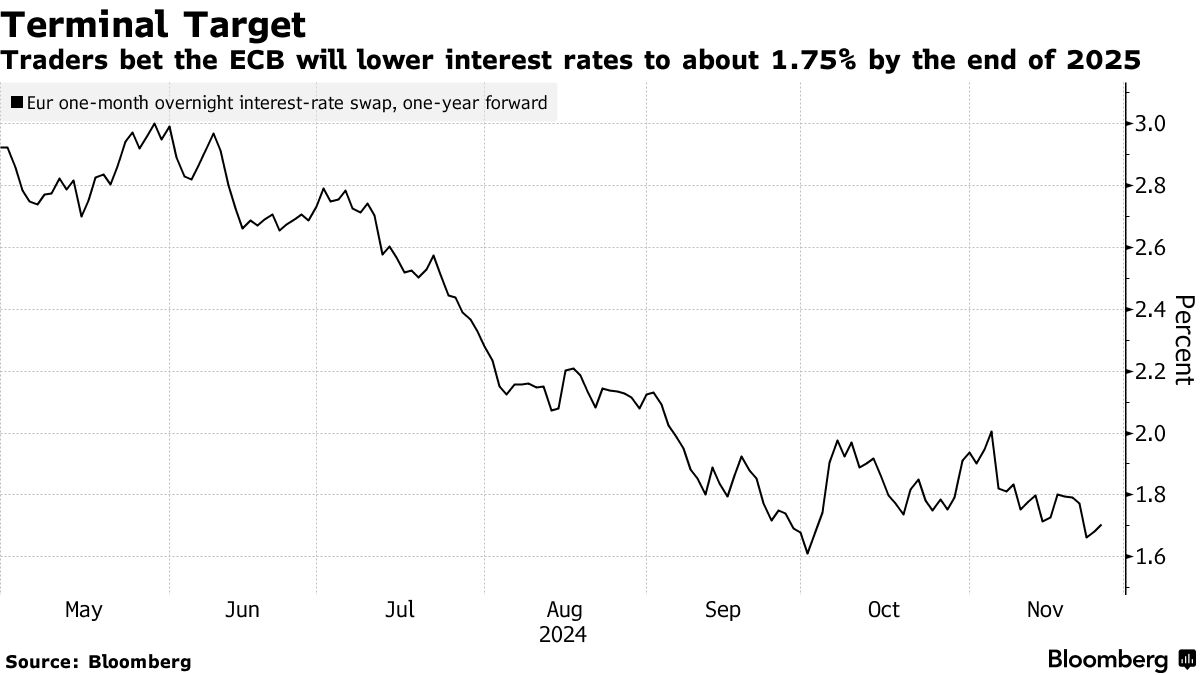 投资者预计明年利率将降至约1.75%,而施纳贝尔承认这与她自己的评估相悖。彭博社调查的经济学家预计它们将在2025年下半年 下降 至2%。