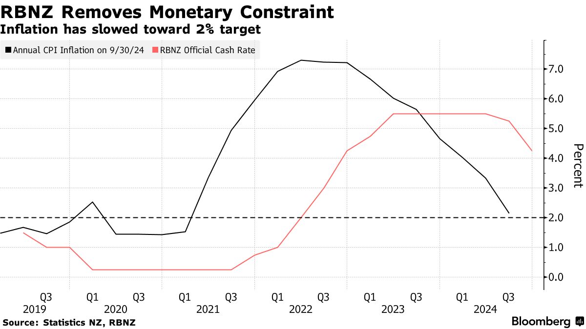 新西兰储备银行的货币政策委员会在惠灵顿将官方现金利率从4.75%下调至4.25%,这一举措得到了23位经济学家中22位的预期支持。这是连续第二次下调50个基点,因为新西兰储备银行希望在通胀得到控制的情况下恢复经济。