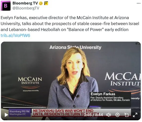 今天在彭博电视台的 权力平衡 早间版中,主持人凯莉·莱因兹采访了亚利桑那州立大学麦凯恩研究所的执行董事埃夫林·法卡斯,讨论以色列与黎巴嫩真主党之间稳定停火的前景以及伊朗的反应。