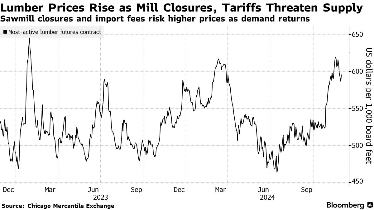 周二,芝加哥的木材期货上涨了最多2.1%,达到每千板尺599美元,此前当选总统在社交媒体上发布消息称,他将 征收 25%的关税,针对来自加拿大和墨西哥的所有商品,除非这些国家遏制芬太尼和移民流入美国。包括 西弗雷泽木业公司 和 英特福公司 在内的林业公司股票下跌。