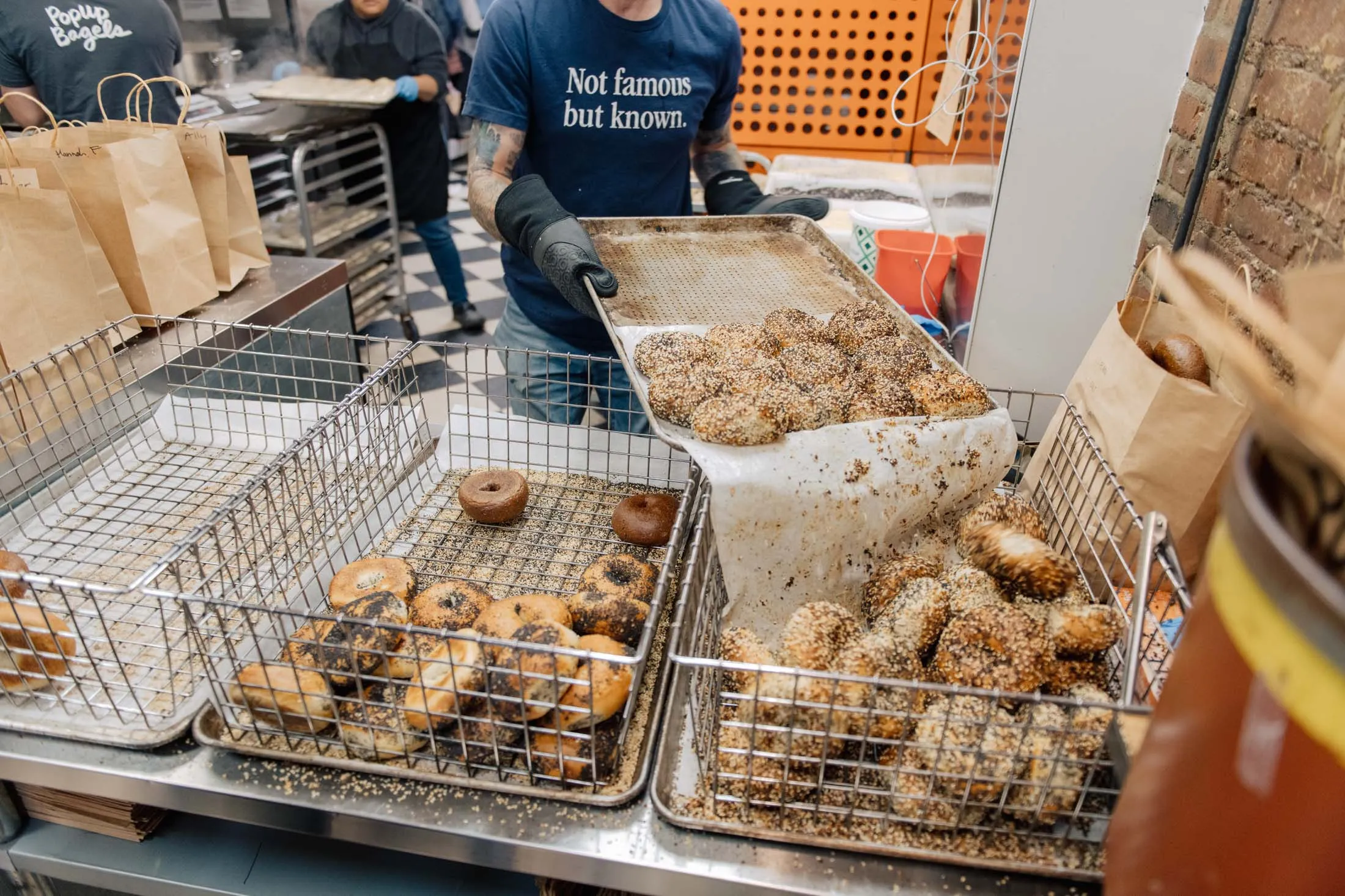 值得一提的是,探索过西海岸贝果场景的西尔弗曼表示,这些贝果比他们的加州表亲更胜一筹,原因最为纽约。“这是因为它的基础是更好的贝果。这让它更具结构完整性和风味,”他说。当店铺的共同拥有者之一,里科·斯蒂芬,过来查看我们时,我们问他这种低调的声誉(我们将使用“不是著名但被人知晓”这个短语,它出现在PopUp Bagels的商品上)是否足够,或者他是否想要来自于在一个以热贝果闻名的城镇中成为新热门贝果所带来的排队和炒作。“我想要。我想要,”他说。“如果你不能迎合忙碌的人群,你就不应该做生意。”