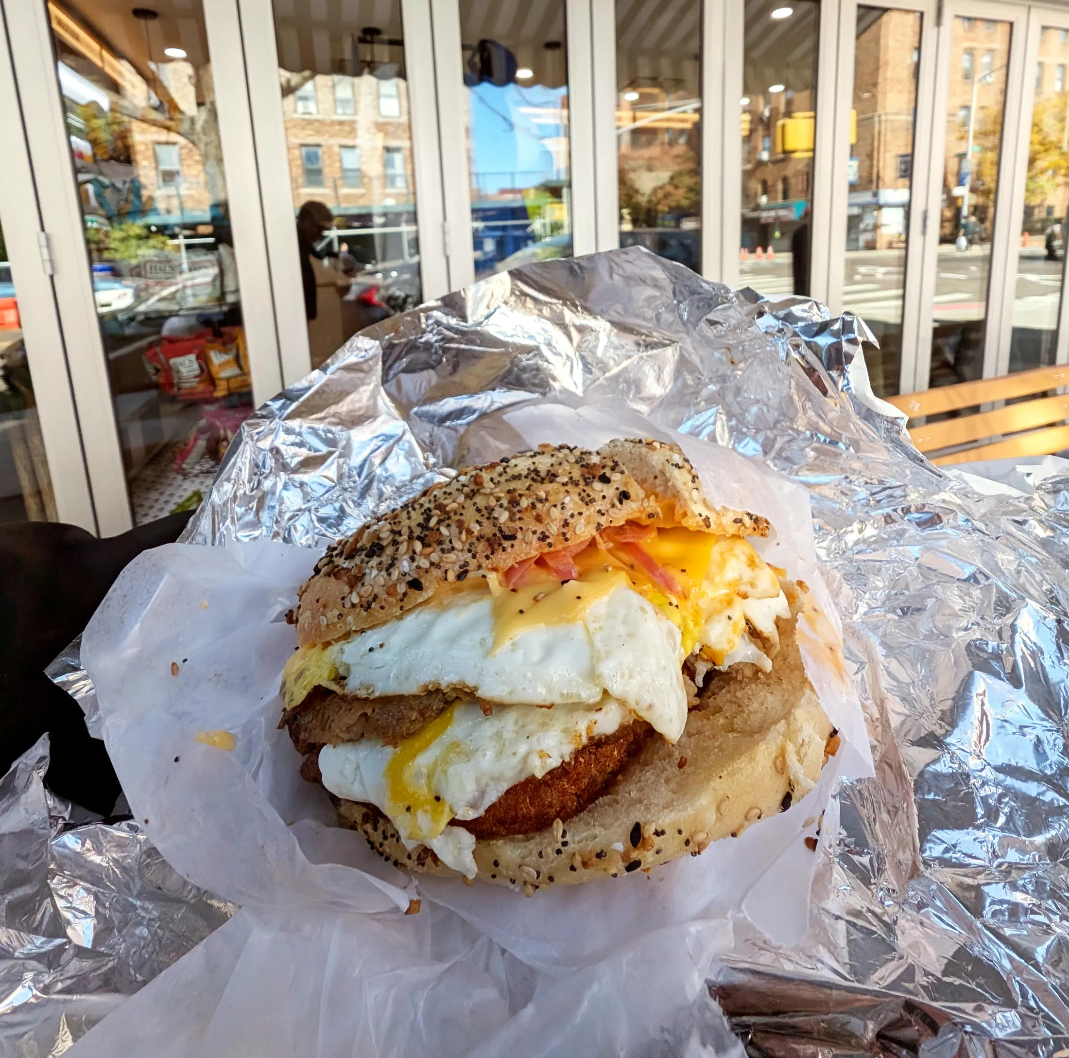 库尔利在皇后区的阳光区,周末吸引大量人群前来享用三明治。摄影师:马修·克朗斯伯格艾迪的三明治柜台另一个从疫情快闪店转为永久的店铺,这家威廉斯堡的热门店即将开设西村分店。芝加哥风格的百吉饼带来额外的物理扭转,将一些香料融入百吉饼中,为像SEC&L这样的三明治增添风味,这是一款香肠、鸡蛋和奶酪三明治,搭配酥脆的土豆饼。