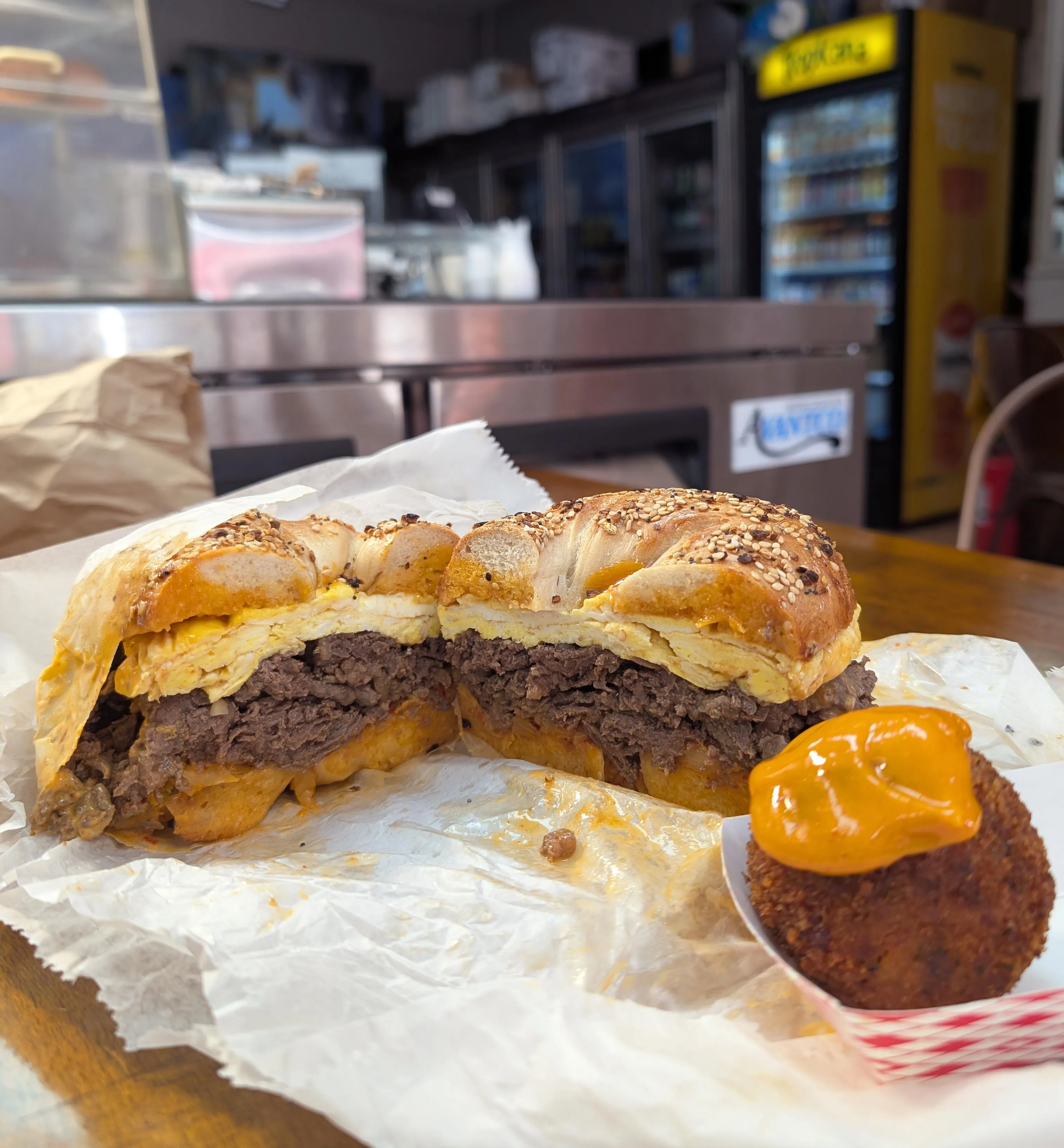 艾迪的三明治柜台的样品。摄影师:克拉克·霍金为彭博追求百吉饼之间在阿斯托里亚一个以希腊酒馆闻名的角落,百吉饼之间带来了不拘一格的幽默和韩国元素,制作出一些城市中最引人注目的三明治。尝试“首尔遇见百吉饼”,其中包含烤牛肉、泡菜、奶酪和韩式辣椒酱蛋黄酱。