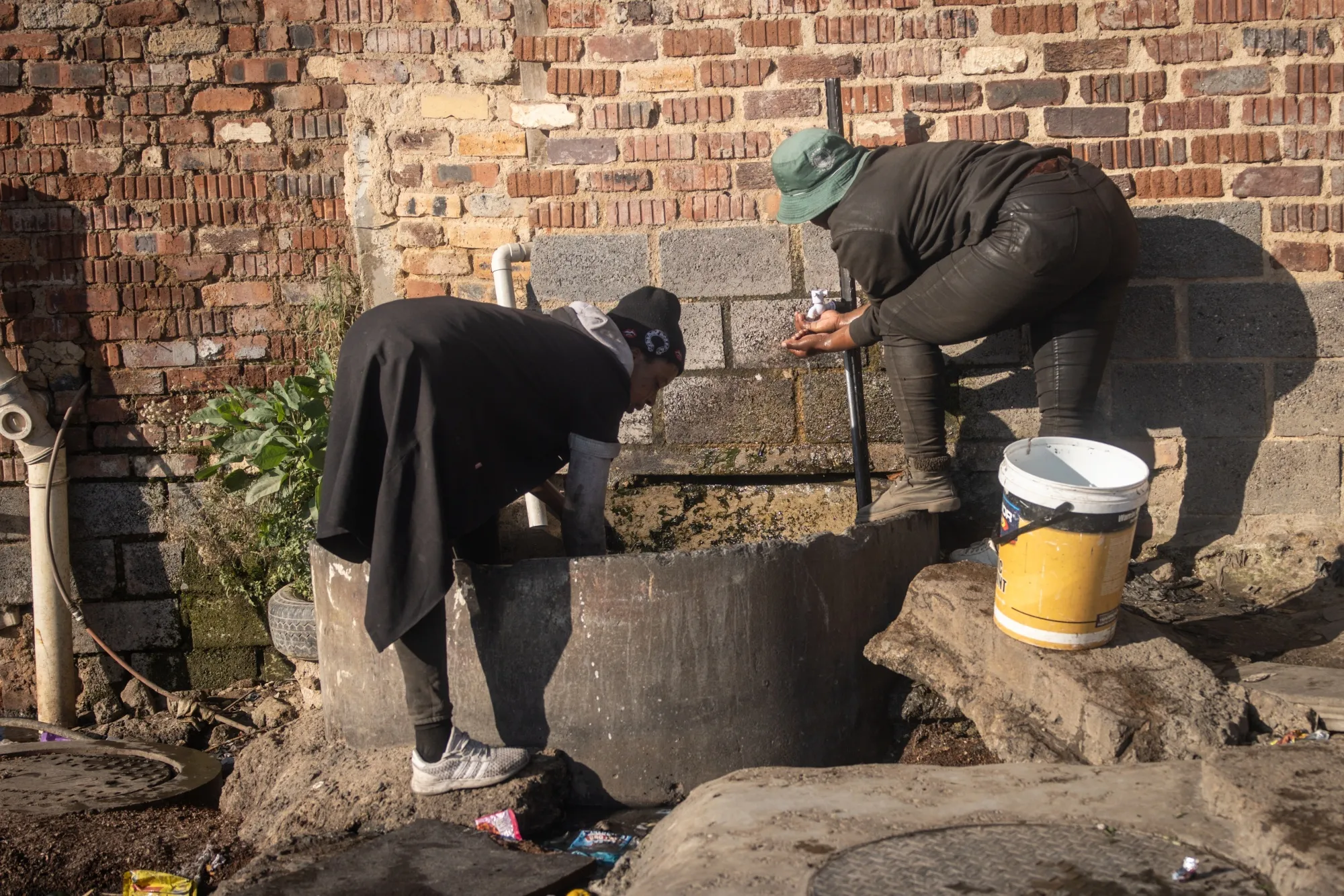 居民在南非约翰内斯堡的一个非正式定居点收集干净的水。