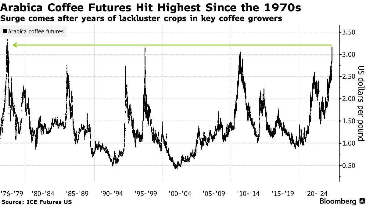 咖啡期货 已达到40多年来的最高水平,因为越南和巴西的干旱持续威胁供应。这对 咖啡因爱好者来说可能是坏消息,因为咖啡馆和烘焙商在整个供应链中面临更高的价格。