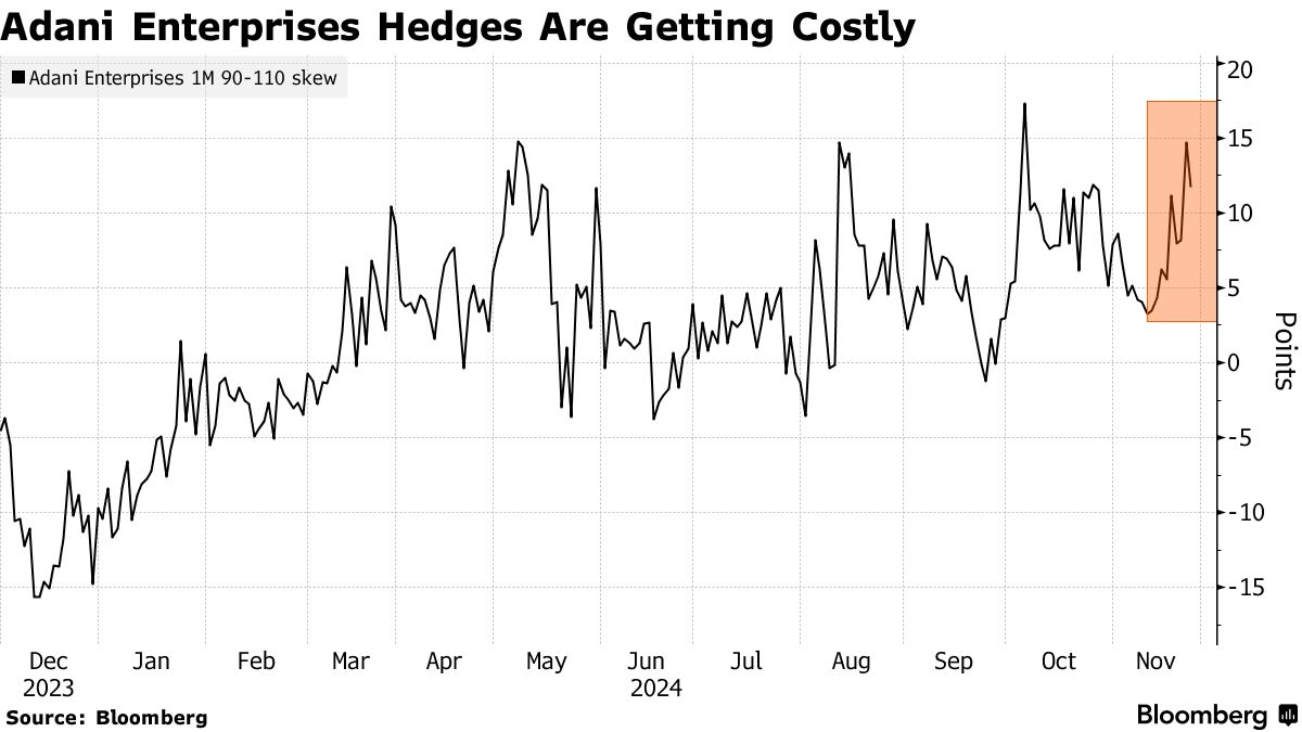 阿达尼集团的股票在周三反弹,但美国指控的影响仍然存在。以旗舰阿达尼企业为例。该股票上涨了12%,2400和2300的11月看涨期权是交易量最大的。同时,对旗舰股票下跌的对冲成本接近本月的峰值。这表明交易者希望通过增强下行保护来保持安全。