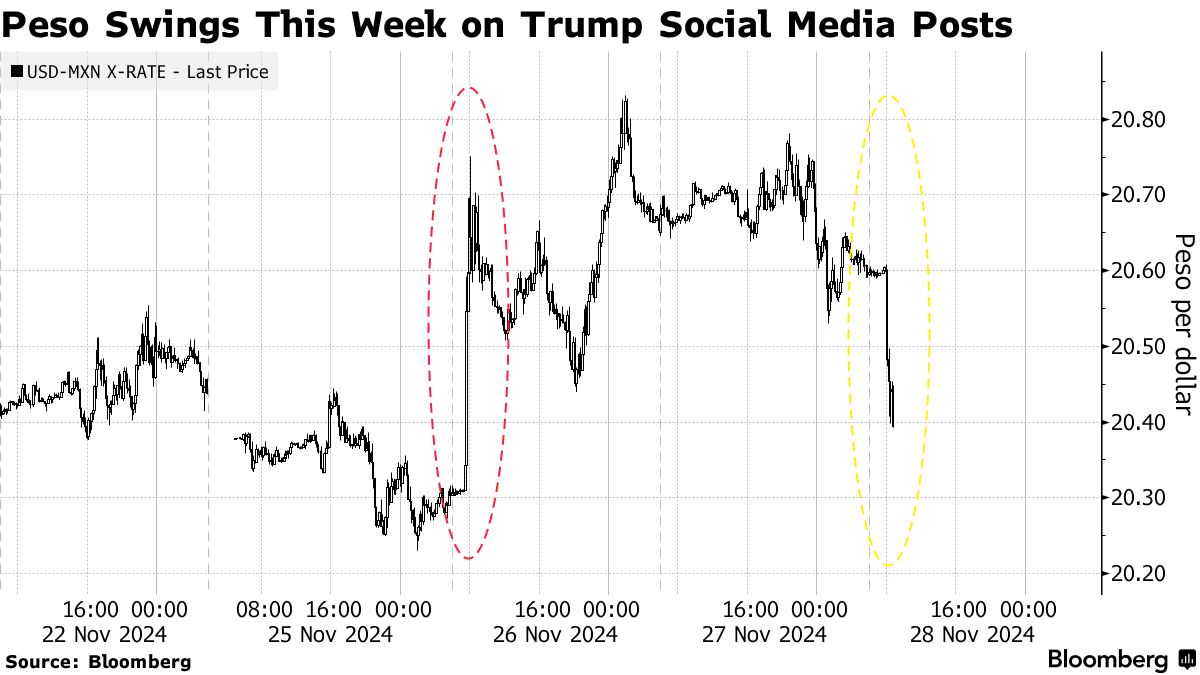 比索的波动是交易者可以期待的最新迹象,交易者可以从当选总统的社交媒体帖子中预期到的波动。本周早些时候,比索跌至两年多以来的最低点,此前特朗普承诺对中国、墨西哥和加拿大征收更多关税,这是他在11月5日当选后首次对全球贸易流动的具体威胁。