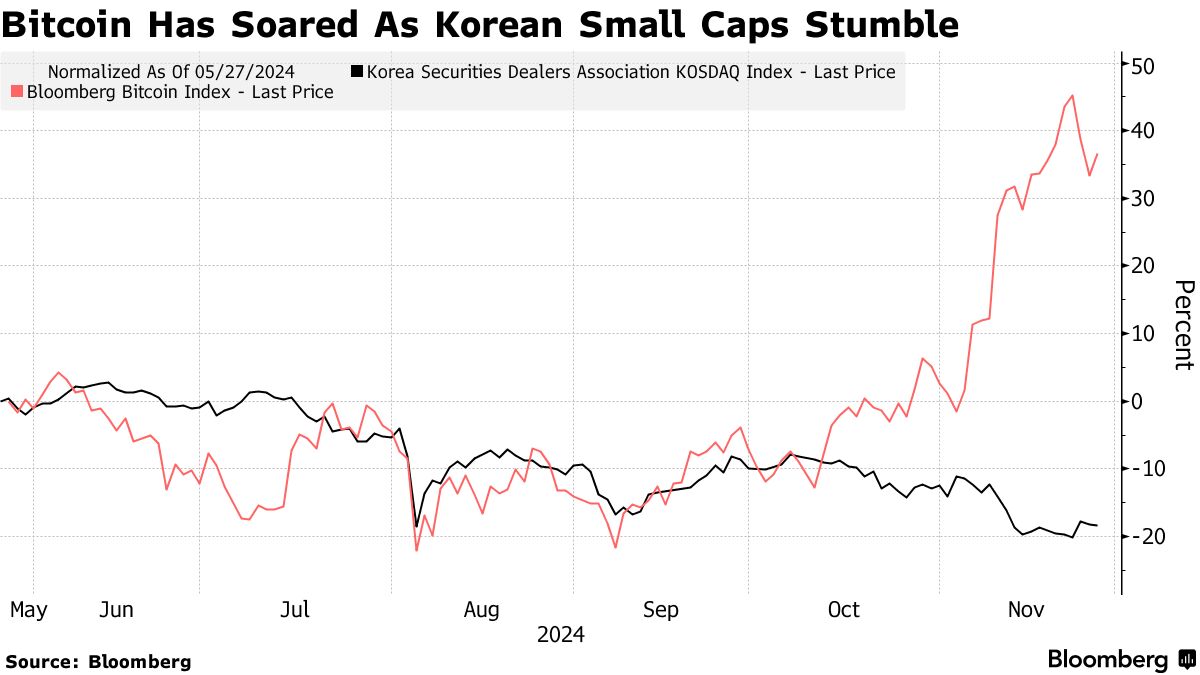比特币自唐纳德·特朗普最近当选以来的迅猛上涨,给资本市场的一个偏远角落施加了压力:韩国的小型股。