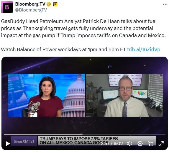 今天在彭博电视台的 权力平衡 早间版中,主持人凯莉·莱因兹采访了GasBuddy的石油分析负责人帕特里克·德·哈恩,讨论了假期期间燃料价格的走势,以及如果特朗普对加拿大和墨西哥征收关税,可能对加油站的影响。